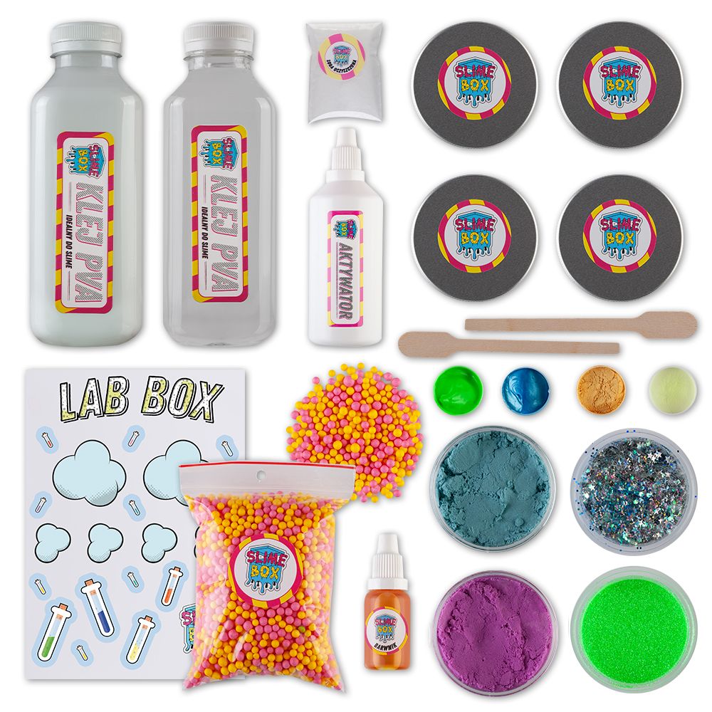Box, w którym znajdziesz pyłek świecący w ciemności! Dzięki niemu stworzysz świecącego slime'a! Ponadto, z produktów zawartych w tym boxie wykonasz wszystkie wyzwania oraz doświadczenia z książki Laboratorium Slime.