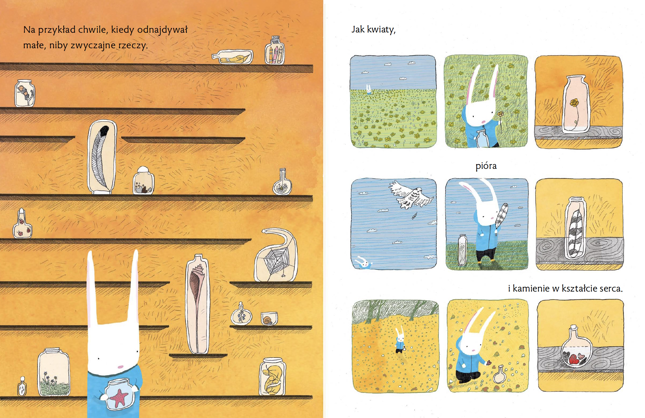 Inspirującą, piękna, wysokojakościowa książka artystyczna, która stanowi uroczy prezent dla przyjaciela lub przyjaciółki, jednocześnie otwierając fascynującą przestrzeń do arteterapii. Tytułowy słoiczek symbolizuje serce. W pierwszej części z serii króliczek uczył się otwierać swoje serce, w kolejnej, o której tu mowa, serce „napełnia”. Serce staje się odrętwiałe, jeśli brakuje mu emocjonalnego połączenia z samym sobą i otoczeniem. Słoiczek napełniony pięknymi drobiazgami jest instrumentem rozwijającym zachwyt i wrażliwość nad tym, co nas otacza. Króliczek Leoś łapie namacalne, fizyczne symbole szczęścia, jak i te bardziej subtelne, trudniejsze do uchwycenia. Następnie dzieli się słoiczkiem z koleżanką. Leoś zainspiruje dzieci do stworzenia słoiczków wdzięczności, uważności, zachwytu i szczęścia: dla siebie, dla innych. Słoiczek ten będzie później pobudzał wyobraźnię dziecka, a wyobraźnia, jak wiadomo, jest tarczą ochronną dla subtelnej psychiki dziecki. Nagrody: #1 Indie Bestseller, Kirkus Reviews Best Book of the Year, A BookPage Best Book of the Year, A Bank Street College of Education Best Book of the Year. Opinie ambasadorek: Książka o zwykłych-niezwykłych momentach, które chcielibyśmy zachować, do których wracamy i które sprawiają, że czujemy się szczęśliwi. To książeczka o uważności. O dawaniu i braniu. O dzieleniu się. O wspólnym kolekcjonowaniu chwil. O przyjaźni. O tym, że nawet kiedy jesteśmy sami, nie musimy być samotni, bo dobrem, radością i zachwytem zawsze możemy podzielić się z innymi nawet, jeśli są daleko - Marta Florkiewicz-Borkowska, Pani FloBo, Nauczyciel Roku 2017, laureatka Nagrody im. Ireny Sendlerowej „Za naprawianie świata”, edukatorka. Wbrew pozorom to nie wielkie, spektakularne gesty składają się na nasze poczucie ogólnego zadowolenia, a drobiazgi dodające magii naszej rzeczywistości: spacer po lesie w słoneczny dzień, psie łapki, szum ulewy, widok pojawiającej się na niebie tęczy, ciepły napój w ulubionym kubku. Jestem pewna, że podobnie jak pierwszą część z serii „Odkręćmy emocje”, moi podopieczni pokochają także i drugą część przygód Leosia. Mały króliczek nie tylko kolekcjonuje swoje wspomnienia w słoiczkach, lecz także pokazuje, jak dzielić je z innymi - Katarzyna Matysek, instagram: psych.in.soma, psycholożka, trenerka TUS.