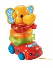 Dziecko układając kółka od największego do najmniejszego uczy się liczyć od 1 do 3 oraz poznaje nazwy kolorów. Po naciśnięciu głowy słonika odpowie on zabawnymi zwrotami i dźwiękami. Każde kółko kryje w sobie kuleczki, co czyni je osobną zabawką – grzechotką. Trąba słonia wykonana jest z miękkiego, miłego w dotyku pluszu, dzięki czemu wzbogaca wrażenia dotykowe i pełni funkcje poznawcze. Autko wyposażone jest w sznurek do ciągnięcia i może jechać wraz z dzieckiem w pełną przygód podróż.
