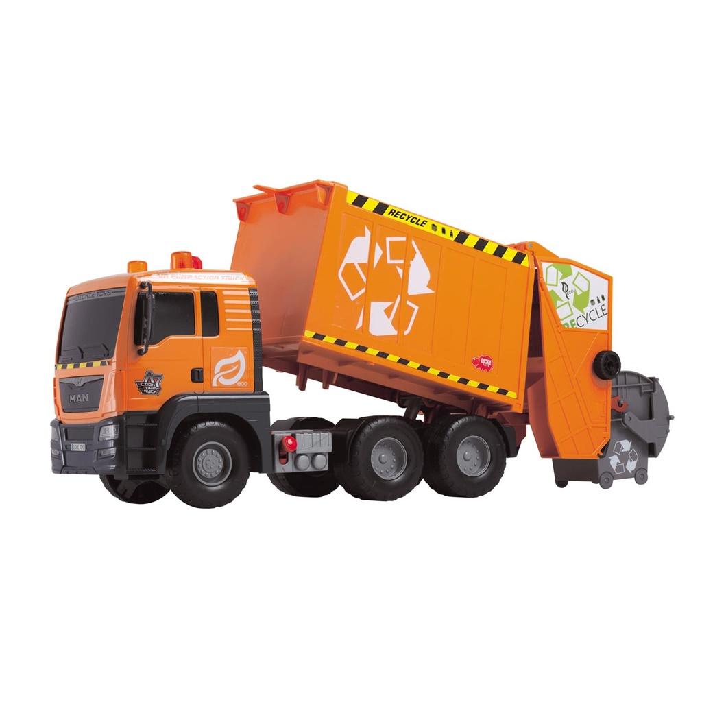 Duża śmieciarka, z ruchomymi elementami, z kontenerem i funkcją podnoszenia kontenera.