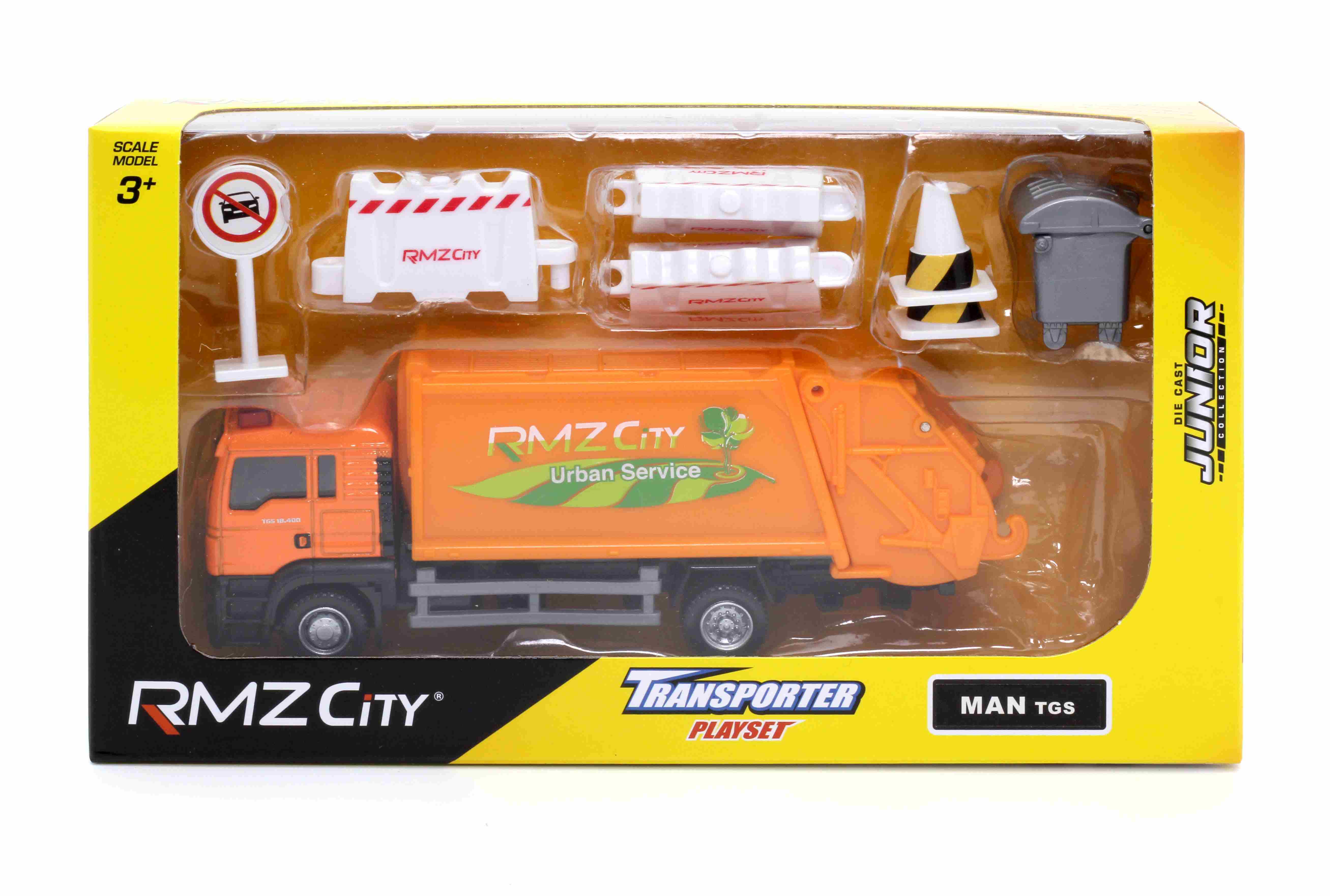 1:64 Zestaw śmieciarka + znaki drogowe + pachołki.