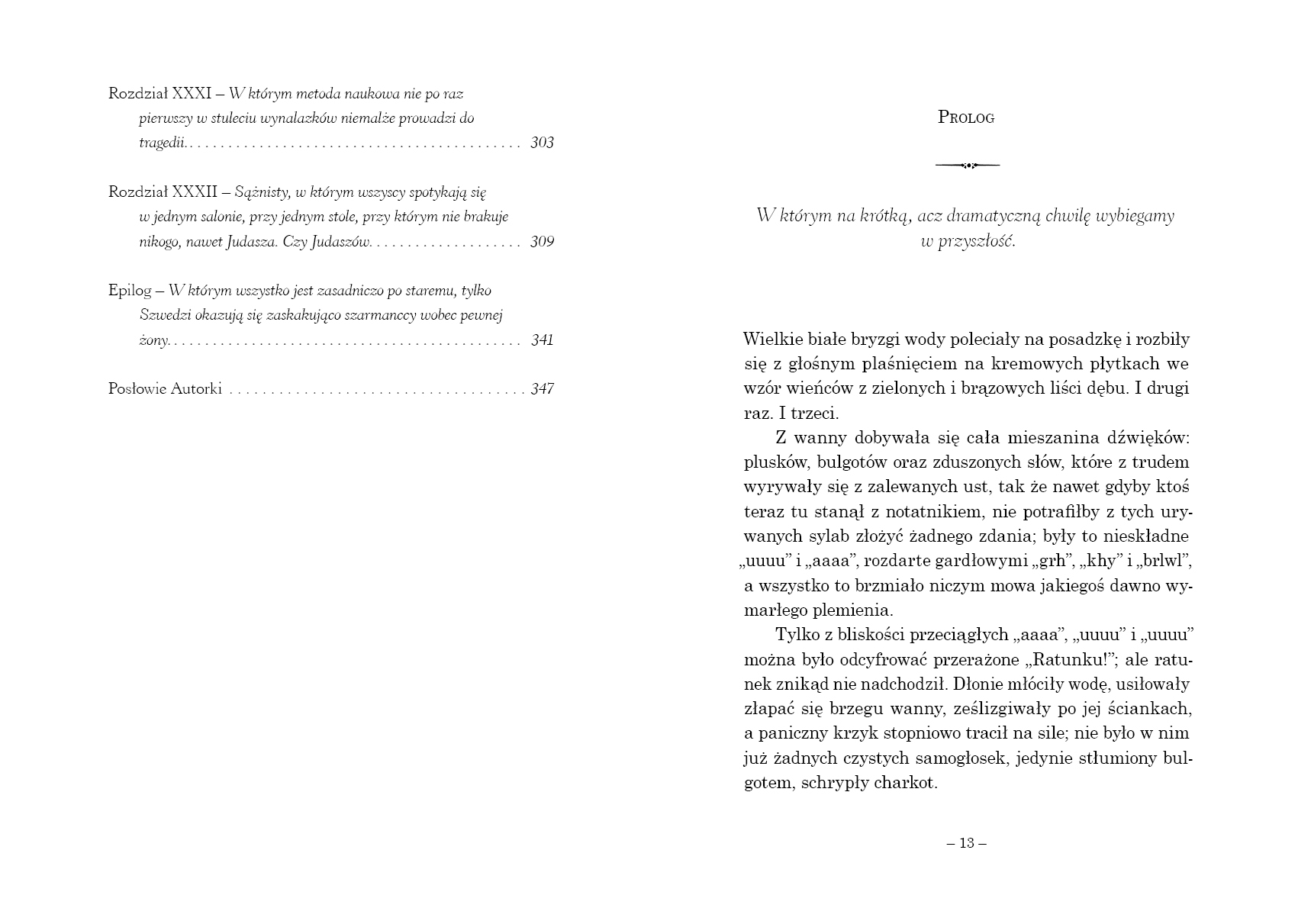 Ulewny lipiec 1903 roku. W Rzymie kona papież, a Kraków nawiedza wielka woda - Wisła występuje z brzegów i zatapia miasto. Rzeczywistość się zmienia, lecz nie dla samozwańczej detektywki Zofii Szczupaczyńskiej, która musi rozwiązać kryminalną zagadkę. Ofiary są dwie: jedna znaleziona w rzece, druga w wannie.