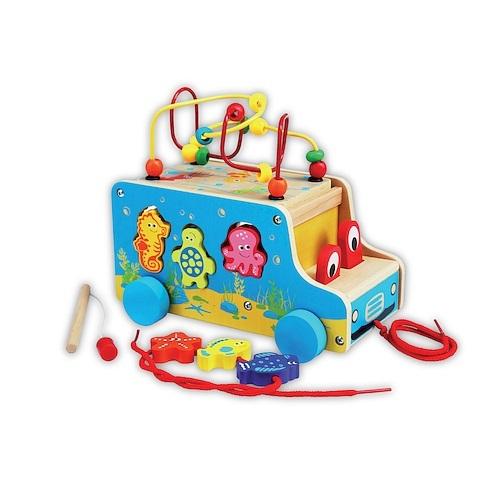 Auto 5 w 1 to wielofunkcyjna zabawka do ciągnięcia. Zapewni dziecku wielogodzinną zabawę pełną atrakcji. Auto ma sznureczek do ciągnięcia i chętnie wyruszy z maluchem w podróż. Podczas spaceru zabawne oczy umieszczone na masce poruszają się. Na dachu pojazdu znajduje się labirynt do przeplatania kolorowych koralików, który można schować do środka. Boki auta to sorter gdzie można dopasowywać klocki w kształcie zwierzątek morskich. Zwierzątka można także nawlekać na sznurek, a dzięki wbudowanym maleńkim magnesom zabawka jest także zręcznościową grą w łowienie rybek.
