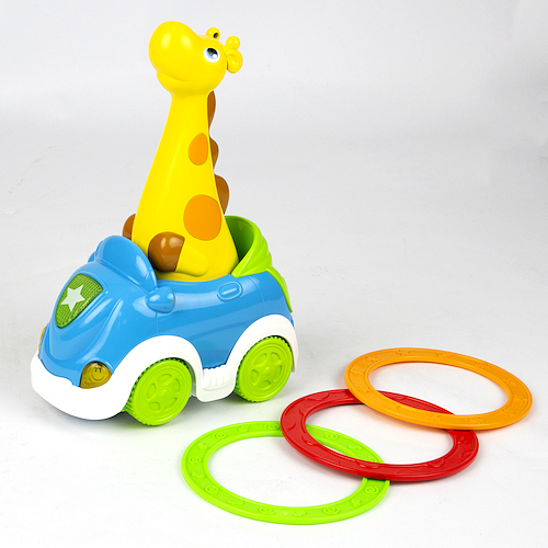 Długa szyja Żyrafki zachęca do aktywnej zabawy w domu i na podwórku. Zestaw zawiera trzy kolorowe obręcze, którymi należy celować w Żyrafkę. Dla utrudnienia zabawy podczas jazdy Żyrafka porusza się do przodu i tyłu.
