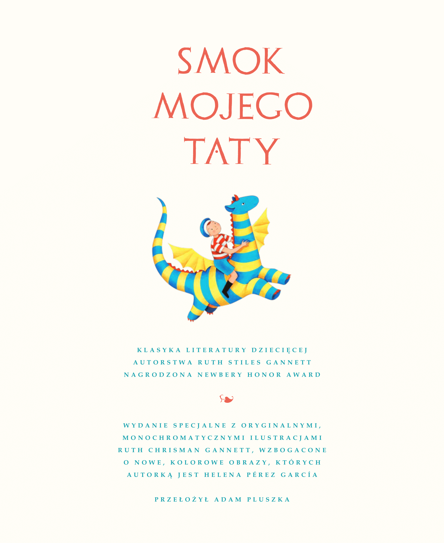 Wspaniała, pełna przygód opowieść o chłopcu, który chciał uratować smoka. Kiedy Elmer od przypadkowo spotkanej kocicy dowiaduje się, że na Dzikiej Wyspie jest przetrzymywany w niewoli młodziutki smok, wie, co robić. Pakuje do plecaka niezwykle ważne i niezbędne rzeczy: grzebień, gumę do żucia, lizaki czy gumki recepturki — po czym dostaje się na statek, którym płynie na daleką, egzotyczną wyspę… Kogo spotka po drodze i w jaki sposób wykorzysta zawartość swojego plecaka? Czy uda mu się dotrzeć do smoka i go uwolnić? „Smok mojego taty” to niezwykle ceniona klasyczna powieść przygodowa dla dzieci. Otrzymała nagrody Newbery Honor Book i ALA Notable Book, a w 2007 roku amerykańskie Stowarzyszenie Edukacji Narodowej umieściło ją na liście „100 najlepszych książek dla dzieci wybranych przez nauczycieli”. W 2012 roku znalazła się na 49. miejscu dziecięcych książek wszech czasów w ankiecie opublikowanej przez School Library Journal. W 2018 roku Netflix ogłosił, że na podstawie książki powstaje animowany film fabularny o tym samym tytule. Premierowy polski przekład autorstwa Adama Pluszki ukazuje się w twardej oprawie i w wyjątkowej, rozszerzonej wersji. W tym specjalnym wydaniu oryginalny tekst Ruth Stiles Gannett i unikalne, monochromatyczne ilustracje Ruth Chrisman Gannett, zostały wzbogacone fantastycznymi, kolorowymi i pełnymi życia pracami ilustratorki Heleny Pérez Garcíi, co nadaje tej klasycznej powieści dla dzieci nowy, ekscytujący wygląd i sprawia, że staje się ona doskonałym prezentem dla każdego, kto kocha piękne książki! Ruth Stiles Gannett Kahn, autorka klasycznej książki dla dzieci Smok mojego taty, powie wam, że nie jest „prawdziwą” pisarką, bo prawdziwi pisarze pracują nad swoimi książkami każdego dnia. Wyjaśni, że jej książkę napisało jej wewnętrzne dziecko i że to właśnie dlatego dzieciom się podoba. Dziś Ruth dobiega już setki i mieszka na farmie w Trumansburgu z jedną z córek. Nadal uwielbia śpiewać — zwłaszcza z innymi — i żyć rozsądnie, kompostując, przetwarzając odpady, spacerując oraz utrzymując kontakt z rodziną i przyjaciółmi. Pozostaje aktywną zwolenniczką praw kobiet i praw obywatelskich, środowiska naturalnego, pokoju i postępowej polityki. Przez lata Ruth otrzymała wiele listów i uwag, które dawały jej do zrozumienia, jak ważny był — i nadal jest — „Smok mojego taty” dla czytelników w każdym wieku na całym świecie. Ruth Chrisman Gannett urodziła się 16 grudnia 1896 roku w Santa Ana w Kalifornii. Od najmłodszych lat uwielbiała rysować — a także wykazywała skłonności do buntu. Podczas studiów na wydziale sztuki Uniwersytetu Kalifornijskiego w Berkeley przełamała bariery płci, kiedy zabrała swoje sztalugi i rozstawiła je na zajęciach dla mężczyzn. Nieraz powtarzała, że rysunek był najlepszym sposobem porozumiewania się z dziećmi męża, w tym z ośmioletnią Ruth Stiles Gannett, z którą później współpracowała zawodowo. Chociaż rysunki i grafiki Ruth pojawiły się w wielu miejscach, w tym na okładkach kilku „New Yorkerów”, a jej ilustracje do „Tortilla Flat” Johna Steinbecka stały się sławne, najbardziej znana jest z ilustracji nagradzanych książek dla dzieci, takich jak „Smok mojego taty”. Helena Pérez García jest hiszpańską ilustratorką, znaną ze swoich koncepcyjnych, bogatych w szczegóły i niezwykle kolorowych obrazów. Głównym środkiem wyrazu Heleny jest gwasz, a głównymi źródłami inspiracji — sztuka, literatura i kino. Po ukończeniu akademii sztuk pięknych w Hiszpanii Helena w 2012 roku przeprowadziła się do Londynu, gdzie mieszkała i pracowała przez sześć lat. Od 2018 roku mieszka w Madrycie. Pracowała dla Penguin Random House, The Body Shop, Tate Publishing, „The Financial Times”, „Reader’s Digest” i „Il Corriere della Sera”.