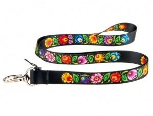Smycz do kluczy w łowickie wzory ludowe . Folk smycz zdobią barwne kwiaty z łowickiej wycinanki na czarnym tle. Wzór na smyczy inspirowany jest tradycyjnym wzorem ludowym z regionu łowickiego. Elementem przewodnim na łowickich wycinankach są koguty, pawie oraz motywy kwiatowe.