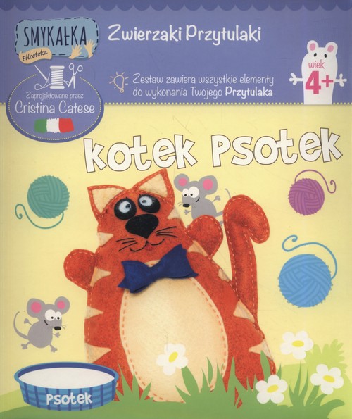 Jestem Kotek Psotek, Co przeskakuje przez płotek. Słuch mam dobry, kocie wąsy, Dzięki nim po zmroku pląsy, To dla mnie pestka, łatwa sprawa,niech trwa kocia zabawa! Mam długi ogon i puszystą sierść, po której lubię być głaskany. Głośno wtedy mruczę. Moi przyjaciele to Misiu Miodek, Królik Ząbek, Chomik Chrupek i Piesek Łatek. Czasami płatam im różne śmieszne figle. Przyłączysz się do naszej zabawy?"" Zwierzaki przytulaki to seria zabawek składająca się z najbardziej rozpoznawanych i ulubionych przez dzieci zwierząt do samodzielnego zszycia. Zabawka jest wykonana z bardzo miękkiego i przyjemnego w dotyku filcu. W opakowaniu znajduje się dodatkowo Mini Album z kolekcją zwierzaków i naklejką zakupionego. Wszystkie elementy do samodzielnego przygotowania produktu znajdują się w zestawie: elementy filcowe z otworami ułatwiającymi szycie, elementy filcu samoprzylepnego, wypełnienie, elementy dekoracyjne, plastikowa igła, zestaw zawiera czytelną i szczegółową instrukcję, ze wskazówkami projektantki, pokazującą wykonanie zabawki krok po kroku.
