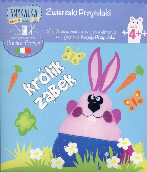 Jestem królik Ząbek, futrzane uszy mam, Po polach i łąkach szybko biegam. Marchewki mają pyszny smak, dlatego zdrowy Ząbek to mój znak! Pląsam, skaczę, koziołki fikam,Za drzewami szybko znikam. Uwielbiam zjadać zdrowe i pyszne marchewki, którymi dzielę się ze swoimi przyjaciółmi: Pieskiem Łatkiem, Misiem Miodkiem, Kotkiem Psotkiem i Chomikiem Chrupkiem. Potrafię bardzo szybko biegać, dlatego wygrywam wszystkie wyścigi i zabawy w przeskoki. Spróbujesz mnie pokonać?"" Zwierzaki przytulaki to seria zabawek składająca się z najbardziej rozpoznawanych i ulubionych przez dzieci zwierząt do samodzielnego zszycia. Zabawka jest wykonana z bardzo miękkiego i przyjemnego w dotyku filcu. W opakowaniu znajduje się dodatkowo Mini Album z kolekcją zwierzaków i naklejką zakupionego. Wszystkie elementy do samodzielnego przygotowania produktu znajdują się w zestawie: elementy filcowe z otworami ułatwiającymi szycie, elementy filcu samoprzylepnego, wypełnienie, elementy dekoracyjne, plastikowa igła, zestaw zawiera czytelną i szczegółową instrukcję, ze wskazówkami projektantki, pokazującą wykonanie zabawki krok po kroku.
