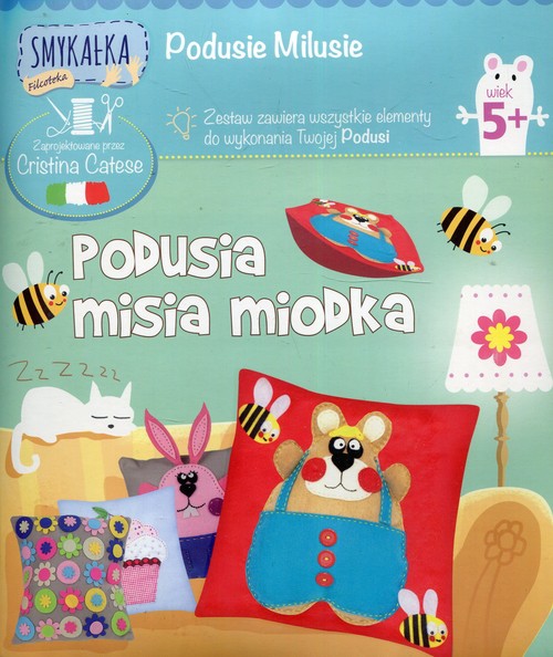 Podusia Misia Miodka to filcowa postać Misia Miodka z serii Zwierzaki Przytulaki w otoczeniu wesołych pszczółek z jednej strony poduszki i wysokiej jakości, miękki polar z drugiej. Wymiar: 30 cm x 30 cm. Wszystkie elementy do samodzielnego przygotowania produktu znajdują się w zestawie: elementy filcowe z otworami ułatwiającymi szycie, elementy filcu samoprzylepnego, wypełnienie, elementy dekoracyjne, plastikowa igła, zestaw zawiera czytelną i szczegółową instrukcję, ze wskazówkami projektantki, pokazującą wykonanie zabawki krok po kroku.