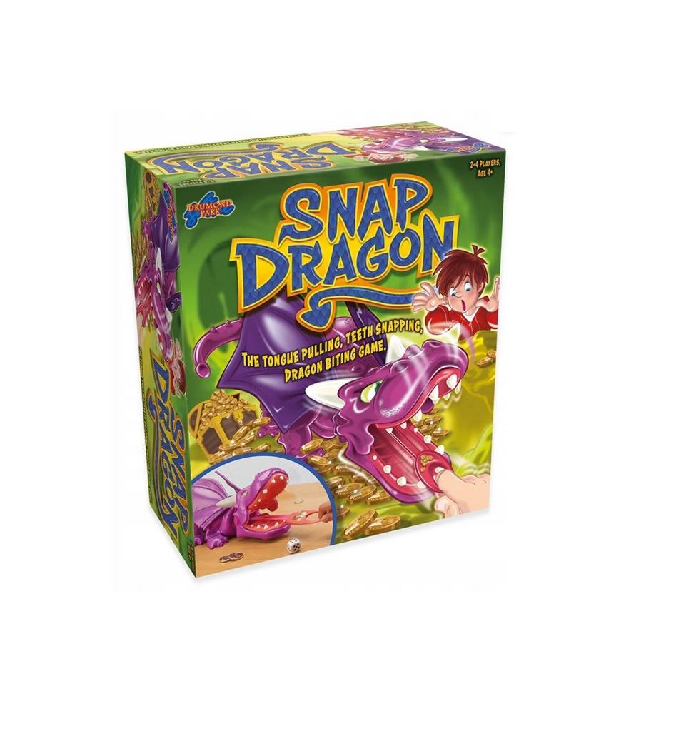 Rzuć kostkę, a następnie pociągnij język smoka tyle razy, ile oczek wypadło na kostce. Uważaj, smok może ugryźć ! A do tego umie wydłużyć szyję. Jeśli Ci się uda wygrywasz monetę, ale jeśli zatrzaśnie paszczę tracisz wszystkie monety, które udało Ci się zebrać. Wygrywa ten gracz, który jako pierwszy zbierze trzy monety.