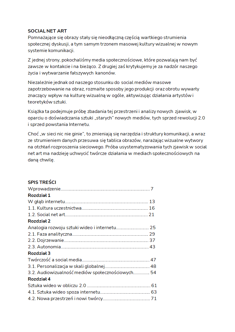 Pomnażające się obrazy stały się nieodłączną częścią wartkiego strumienia społecznej dyskusji, a tym samym trzonem masowej kultury wizualnej w nowym systemie komunikacji. Z jednej strony, pokochaliśmy media społecznościowe, które pozwalają nam być zawsze w kontakcie i na bieżąco. Z drugiej zaś krytykujemy je za nadzór naszego życia i wytwarzanie fałszywych kanonów. Niezależnie jednak od naszego stosunku do social mediów masowe zapotrzebowanie na obraz, rozmaite sposoby jego produkcji oraz obrotu wywarły znaczący wpływ na kulturę wizualną w ogóle, aktywizując działania artystów i teoretyków sztuki. Książka ta podejmuje próbę zbadania tej przestrzeni i analizy nowych zjawisk, w oparciu o doświadczania sztuki „starych” nowych mediów, tych sprzed rewolucji 2.0 i sprzed powstania Internetu. Choć „w sieci nic nie ginie”, to zmieniają się narzędzia i struktury komunikacji, a wraz ze strumieniem danych przesuwa się tablica obrazów, narażając wizualne wytwory na otchłań rozproszenia sieciowego. Próba usystematyzowania tych zjawisk w social net art ma nadzieję uchwycić twórcze działania w mediach społecznościowych na daną chwilę.