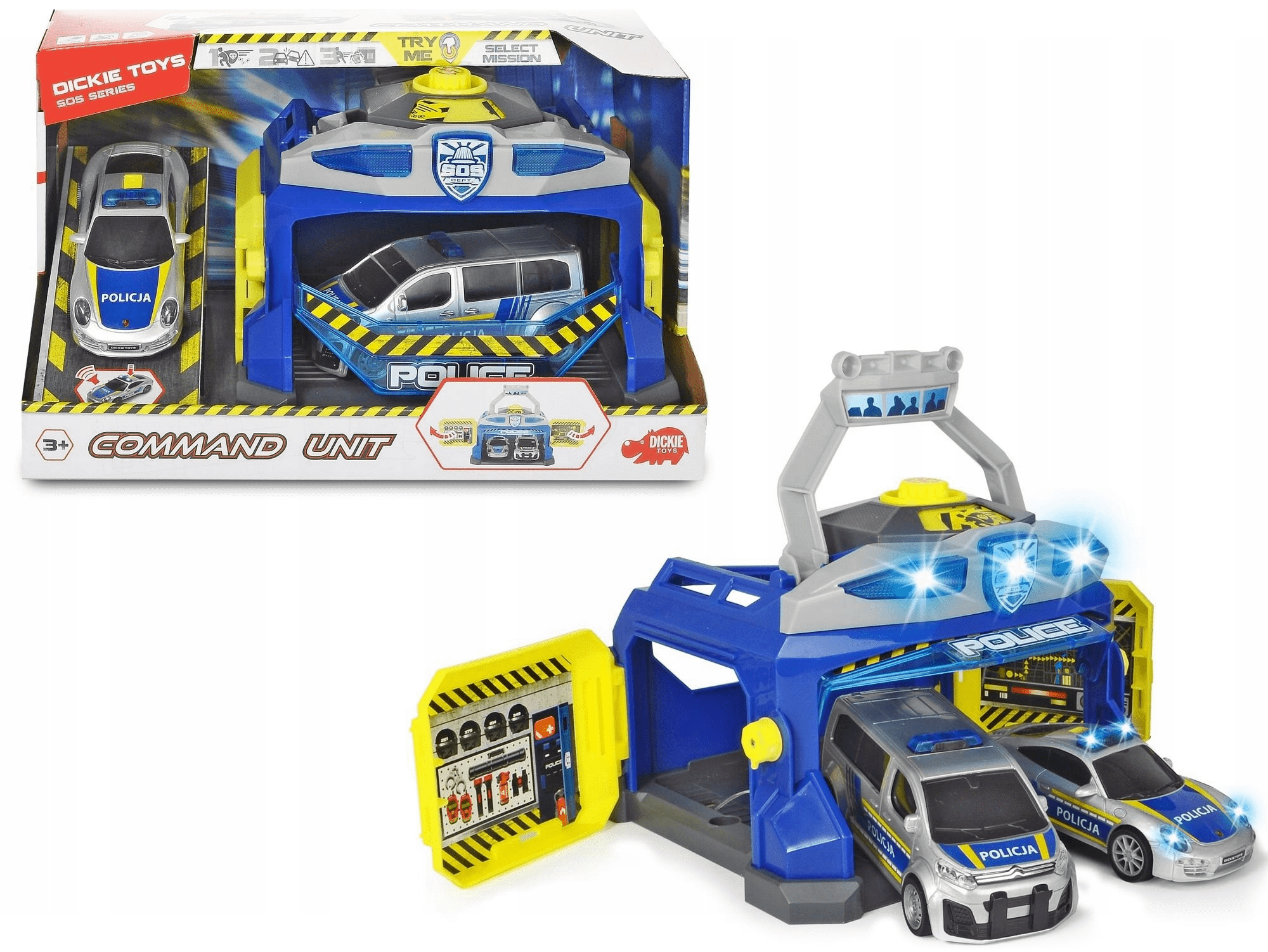 Policyjna jednostka dowodzenia wyposażona w światło i dźwięk, otwierane boczne panele, rączkę do przenoszenia, 2 pojazdy policyjne marki Porsche i Citroen, bez napędu, ze światłem i dźwiękiem, Try Me, WERSJA POLSKA, baterie 2 x 1,5 V R3 w zestawie