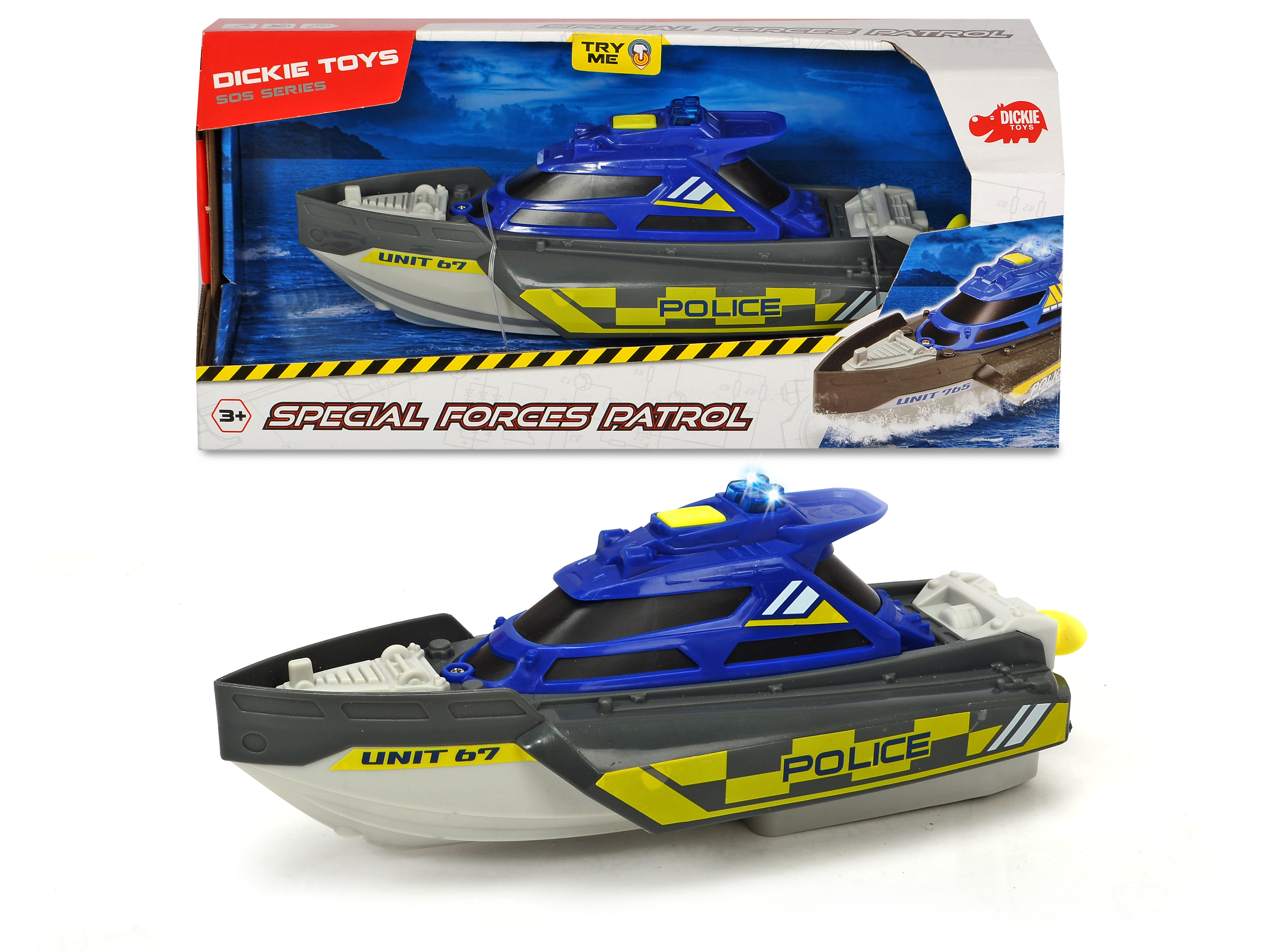 Policyjna Łódź Służb Specjalnych wyposażona w światło i dźwięk, ze sznurkiem do napędzania, 1:24, 24cm. W zestawie baterie 3x1,5V LR44.