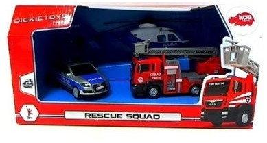Zestaw pojazdów ratunkowych: straż pożarna, helikopter policyjny, samochód policyjny