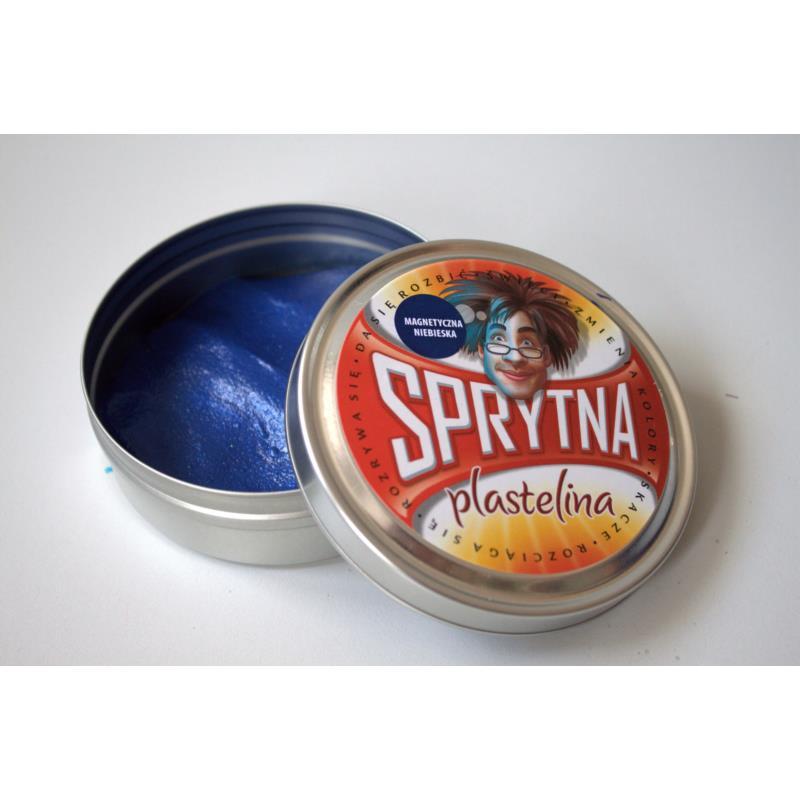 Nowa, niebieska wersja. Proszę wyciągnąć z plasteliny włókno i przyłożyć do niej magnes. Kolor ten przyssie się do niego! Jeżeli położycie ją Państwo ukośnie i umieścicie przed nią magnes to zaobserwujecie jak plastelina zakrada się do niego. Ta miękka magnetyczna masa przyciąga i odpycha pobliski magnes. Jej subtelne drgania rozjaśniają umysł. Przy magnesie nagle ożywa. Silna na tyle aby oszukać grawitację, lub podnieś spinkę czy pineskę przy naładowaniu polem magnetycznym. Wyprodukowana w USA, markowa masa plastyczna wprowadzająca w osłupienie zarówno dużych jak i małych. Szereg nietypowych właściwości sprawia, że plastelina stanowi niezapomnianą edukacyjną zabawkę dla dziecka, nowatorski gadżet dla nastolatka czy też antystres dla dorosłej osoby. Oto niektóre z jej właściwości: skacze jak piłeczka, rozciąga się jak guma do żucia, rozrywa się jak papier, rozbija się jak porcelana. A niektóre: dają się rysować światłem, świecą, przyciągają się do magnesu. Magnetyczna Sprytna Plastelina posiada unikalne zapierające dech w piersiach właściwości. Zachowuje się jak jak inne sprytne plasteliny czyli: rozciąga się, skacze, dowolnie kształtuje. Natomiast przy polu magnetycznym uruchamia swoje ukryte siły. Nagle potrafi przyciągać i odpychać. W każdej puszce jest około 100 gram plasteliny. Kolory sprytnej plasteliny inaczej odbijają światło i są metaliczne.