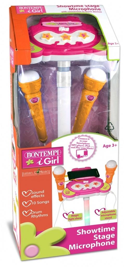 2 mikrofony sceniczne z regulowaną wysokością z serii Bontempi iGirl. Zabawka posiada 10 piosenek demo, efekty dźwiękowe tłumu i aplauzu oraz 6 rytmów perkusyjnych. Możliwość uruchomienia efektów świetlnych. W zestawie znajduje się kabel do połączenia ze źródłem dźwięku - smartfonem, iPodem lub innym. Do poprawnego funkcjonowania wymaga 3 baterii R6/AA 1,5V, które nie są dołączone.