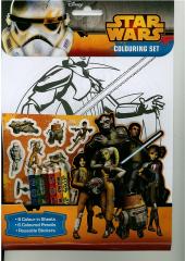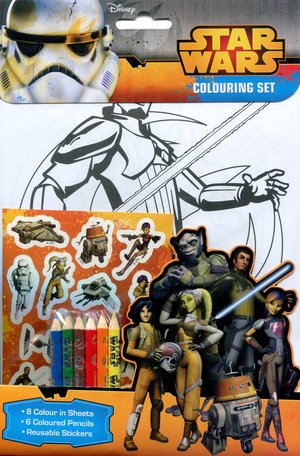 Zestaw zawiera 8 arkuszy do kolorowania, 1 arkusz naklejek, 6 kredek.