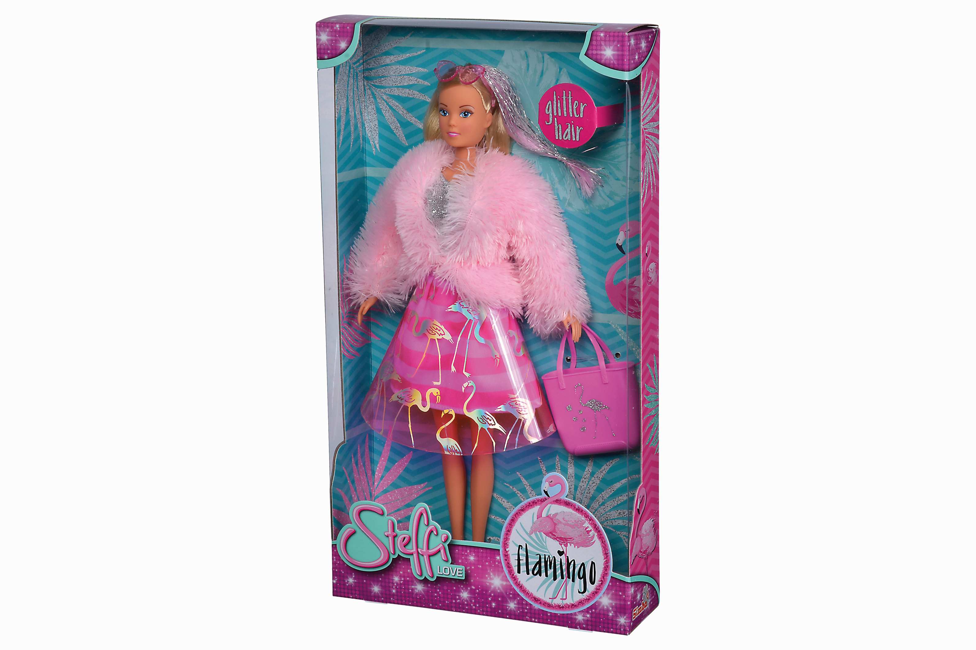 Najnowsza stylizacja Steffi Flamingo przykuwa uwagę nie tylko miłośników najświeższych trendów mody. Steffi zachwyca awangardową stylizacją, która wyróżnia się niestandardowym połączeniem futrzanej kurtki z sukienką, której top jest srebrny a dół jest dwuwarstwowy - na spódnicę nałożony jest półprzezroczysty klosz z nadrukowanymi, srebrzystymi flamingami. Zabawę urozmaicą takie dodatki jak: doczepiane włosy, okulary przeciwsłoneczne oraz stylowa torebka na zakupy. Wysokość lalki: 29 cm.