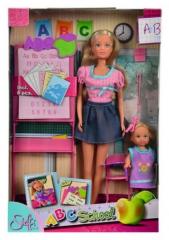 Lalka Steffi w szkole, z uczennicą Evi, w zestawie tablica i pomoce szkolne.