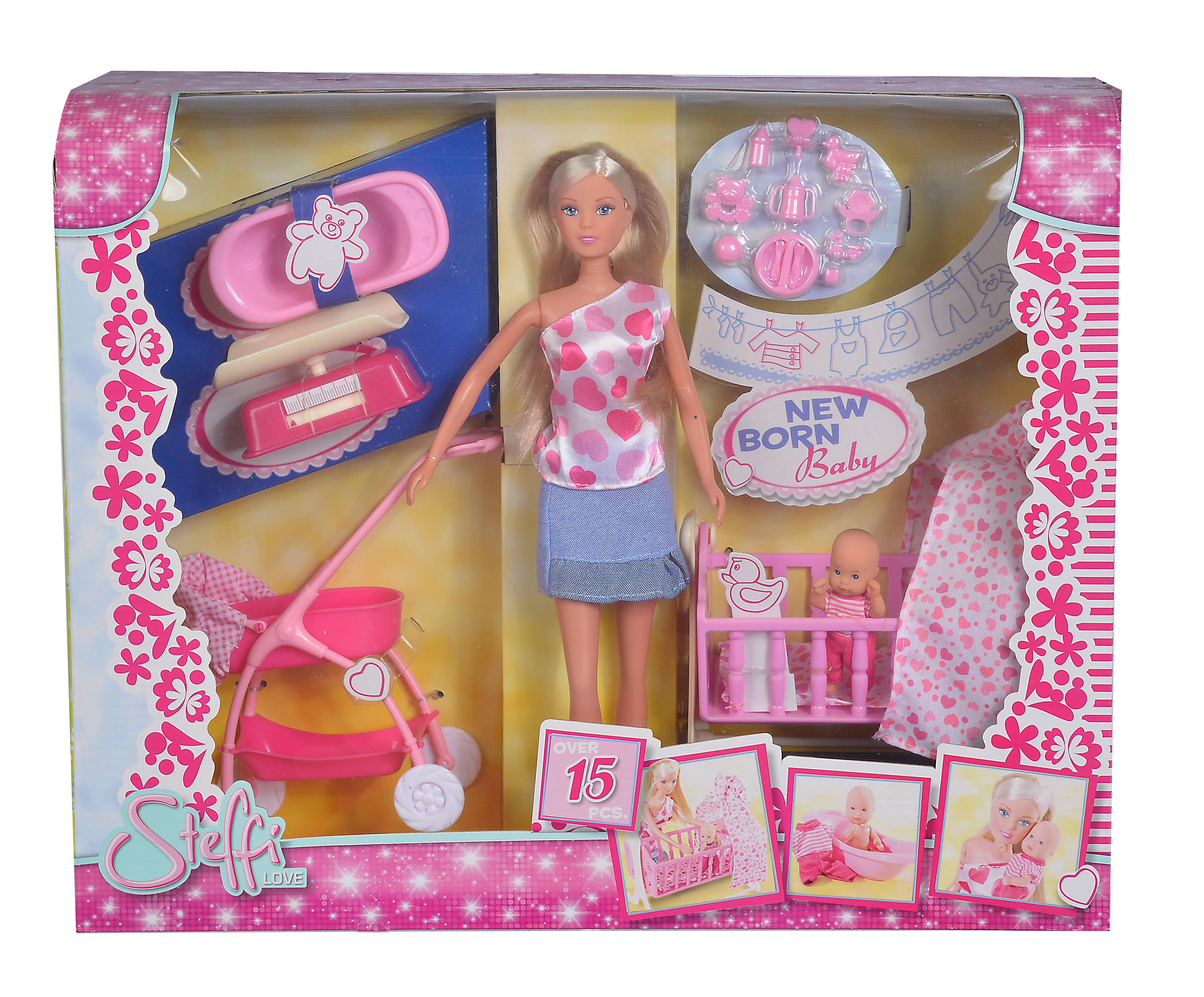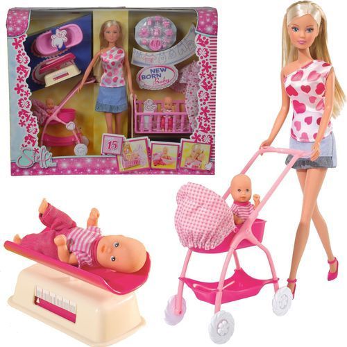 Lalka Steffi w zestawie z niemowlakiem, wózkiem dla dziecka, kołyską, wanienką, wagą i akcesoriami.