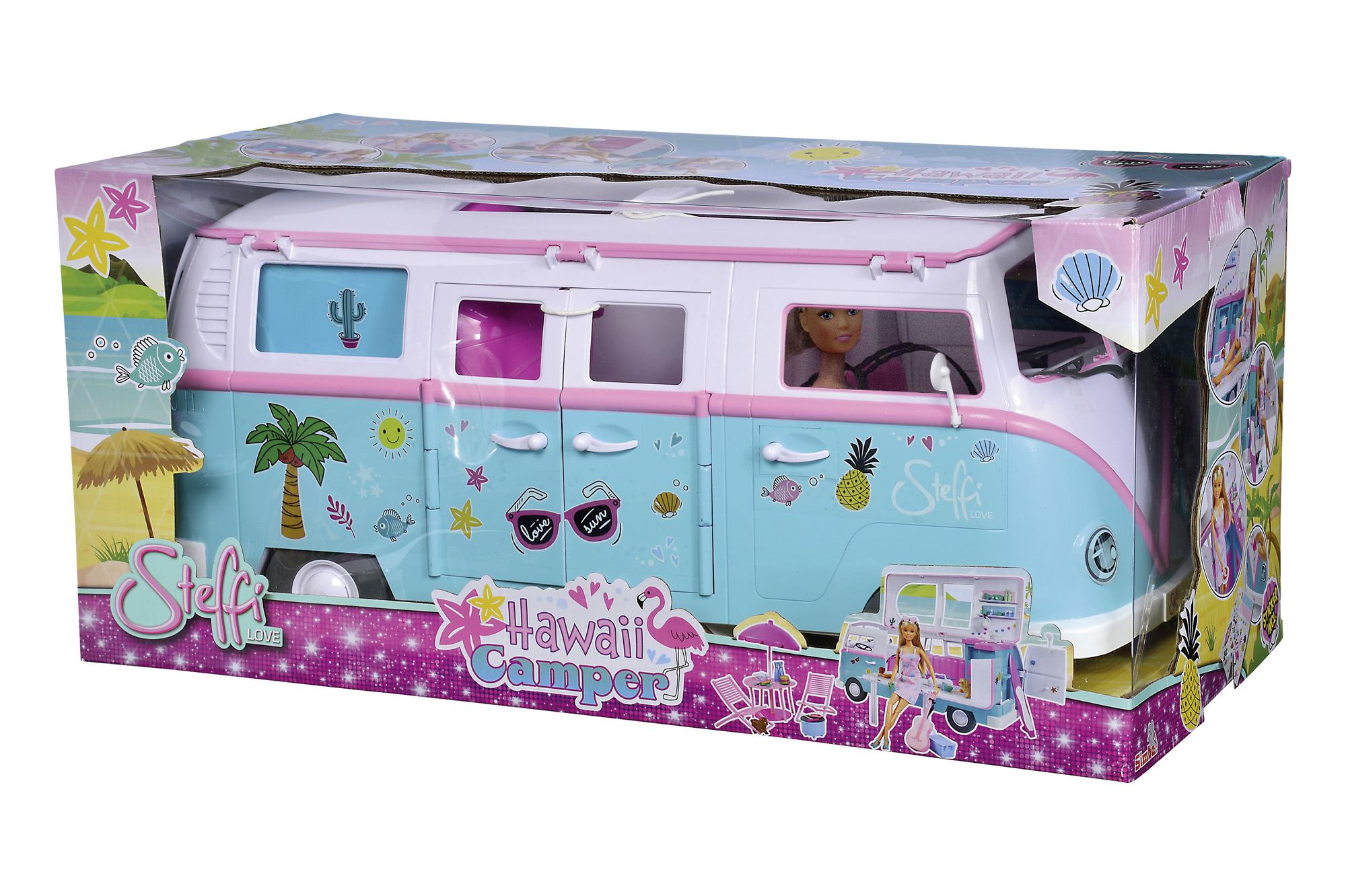 Wyrusz w drogę kamperem razem ze Steffi i przeżyj mnóstwo niezwykłych przygód! Zabawa jest jeszcze bardziej ekscytująca dzięki licznym akcesoriom. Popchnij pojazd, aby ruszyć w nieznane. Czas na wymarzone wakacje! Lalka Steffi z długimi, blond włosami ubrana jest w różowo-niebieską sukienkę i buty. Jest gotowa, aby wyjechać na wakacje swoim uroczym kamperem, który przekształca się z samochodu w wycieczkową strefę zabawy z łóżkiem, łazienką i kuchnią oraz wieloma dodatkowymi akcesoriami wyposażenia. Dodatkowo zestaw zawiera akcesoria do spędzania wolnego czasu przy grillu z gitarą lub na desce surfingowej. Dziewczynki pokochają niezliczone możliwości wyrażania siebie i opowiadania przeróżnych historyjek! To wspaniały prezent dla dzieci od 3 roku życia.