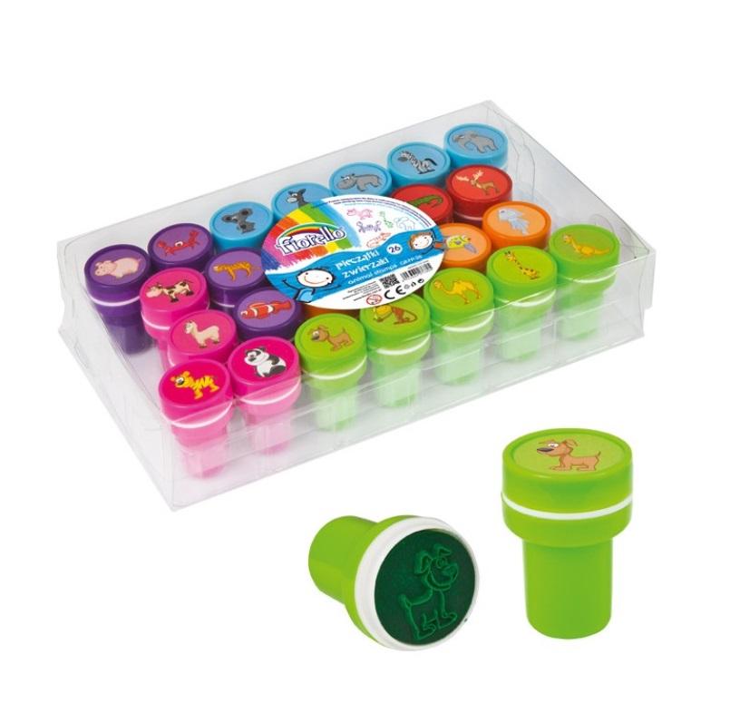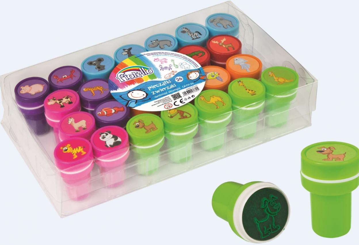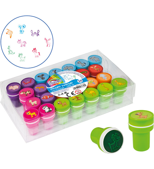zestaw pieczątek z wzorami zwierząt do ozdabiania zeszytów, prezentów, zaproszeń, listów, prac plastycznych nasączone kolorowym tuszem odciśnięte kontury można pokolorować kredkami 26 wzorów w 6 kolorach
