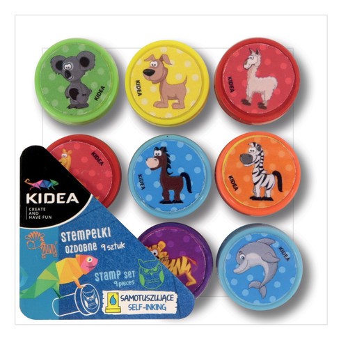 Stempelki w wygodnym plastikowym pudełeczku, w nowych wzorach ze zwierzątkami: lew, tygrys, słoń, zając, lis, pies, pingwin, małpka i panda. Są samotuszujące, więc nie wymagają używania dodatkowej poduszki z tuszem.