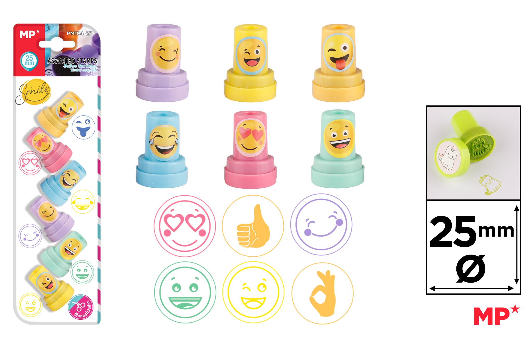 Stempelki dla dzieci z plastikowym uchwytem, który idealnie dopasowuje się do małych rączek. Pieczątki dostępne w różnych kolorach i wzorach. Świetnie sprawdzą się jako drobny upominek. Rozwijają kreatywność i wyobraźnię. Blister zawiera 6 różnych pieczątek w podobnej tematyce. Średnica pieczątki: 25mm.