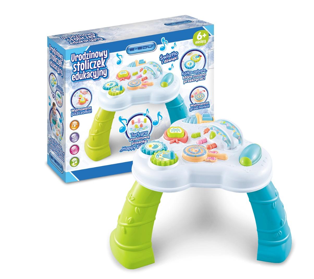 Funkcje: wyjmowane piszczące jabłko, wyjmowany lizak-grzechotka, obrotowe elementy w różnych kształtach oraz wyjmowany, świecący, grający urodzinową piosenkę tort.