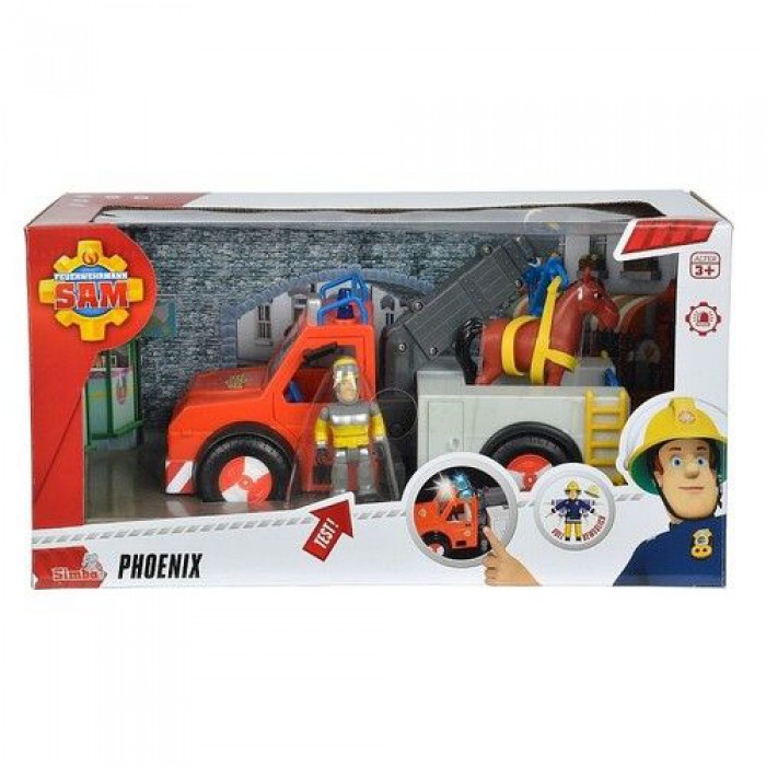 Strażak Sam - pojazd z figurką, zawartość i cechy: - pojazd Phoenix zawiera efekty świetlne, ruchome koła, hak holowniczy, przyczepę, ruchome ramię z hakiem