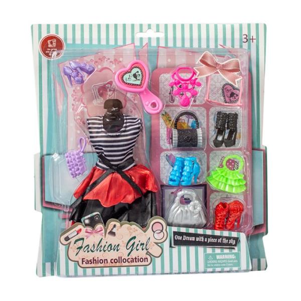 Mix wzorów. Towar wysyłany losowo. Cena za pjedyńczą sztukę. W zestawie znajduje się sukienka i 11 dodatków do stroju: buty, torebki, okulary, bizuteria.