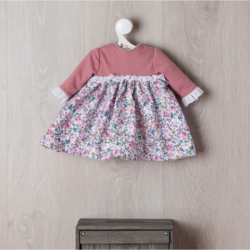 Luksusowy projekt stroju dla lalki hiszpańskiej o wysokości około 57 cm wyróżnia się modną kolorystyką i oryginalnym zestawieniem wysokiej jakości tkanin. Ręcznie szyta sukienka z długim rękawem została wykonana z pudrowo-różowego, gładkiego materiału oraz białej tkaniny w kolorowe wzory kwiatowe. Zwraca uwagę eleganckie wykończenie za pomocą białej gipiury. Sukienkę, dzięki zastosowaniu rzepa z tyłu, można z łatwością zakładać i zdejmować. Idealnie pasuje na lalki hiszpańskie z linii ASI Pepa.