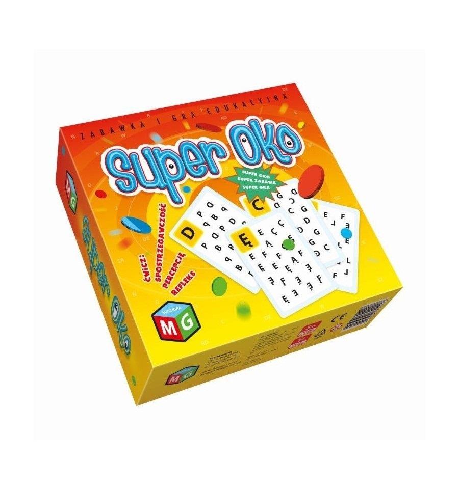 Umiejętność czytania wymaga od nas dobrej znajomości liter, dekodowania obrazu graficznego i skojarzenia go z odpowiednim dźwiękiem.Ten trudny proces poznawczy wymaga od dziecka wielkiego zaangażowania i ogromnej ilosci ćwiczeń. Propozycja zabawy i gry- SUPER OKO- to doskonałe ćwiczenia w rozpoznawaniu i identyfikowaniu znaków graficznych pisma. Zadanie graczy polega na tym, by odszukać w gąszczu liter poprawne 3 wersje litery podanej w górnym lewym rogu każdej planszy. Zawartość pudełka: 28 plansz z literkami, 40 żetonów, instrukcja.