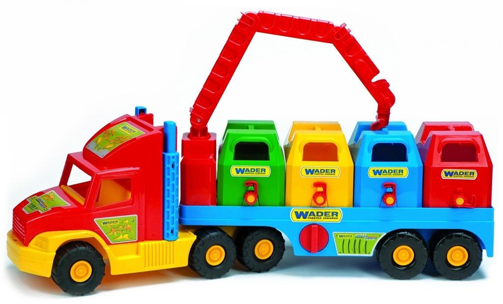 Super Truck śmieciarka to duże, 77 centymetrowe auto ze znanej i cenionej serii Super Truck. W skład zestawu wchodzą 4 kontenery na śmieci z otwieranym spodem oraz dźwig, który ma możliwość ściągania ich z ruchomej naczepy.