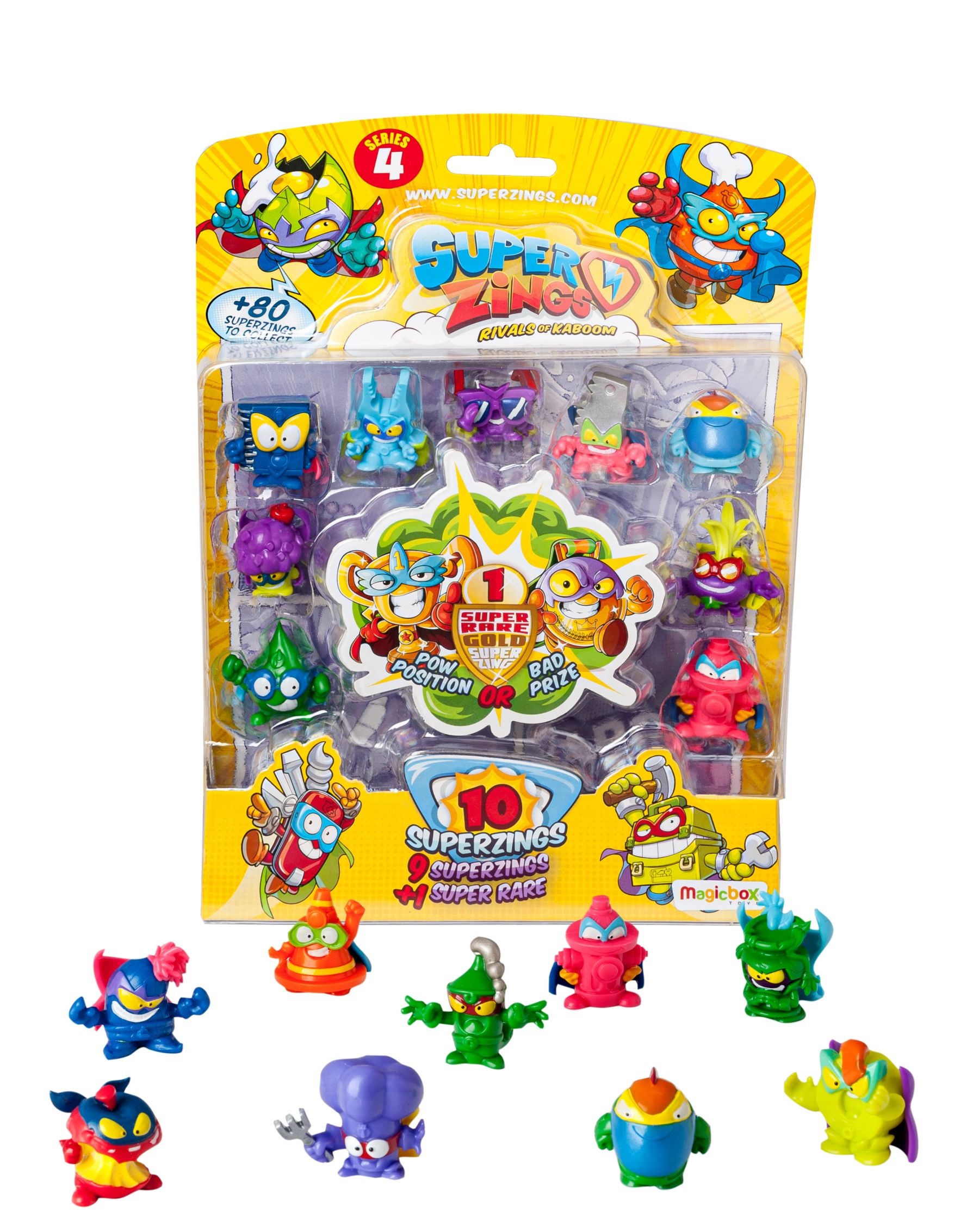 SuperZings to przedmioty codziennego użytku przekształcone w SuperBohaterów i Złoczyńców. W 4. serii jest ponad 80 figurek SuperZings do zebrania! Ten spektakularny blister to najszybszy sposób na powiększenie własnej kolekcji. Zawiera aż 10 postaci, w tym jedną rzadką i trudną do zdobycia złotą figurkę Pow Position lub Bad Prize.