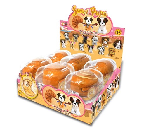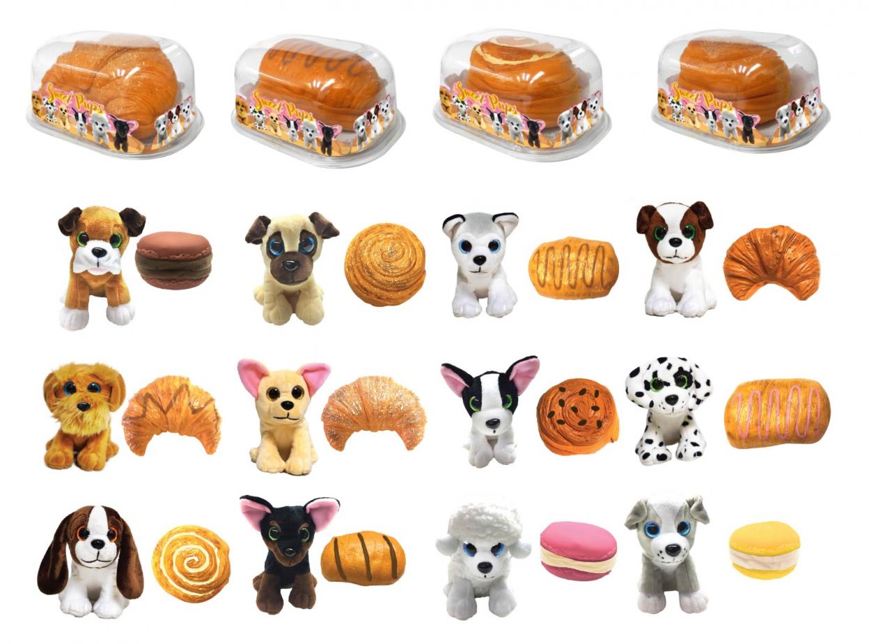 Pluszowe pieski zapakowane w miękkie futerały w kształcie bułeczek.