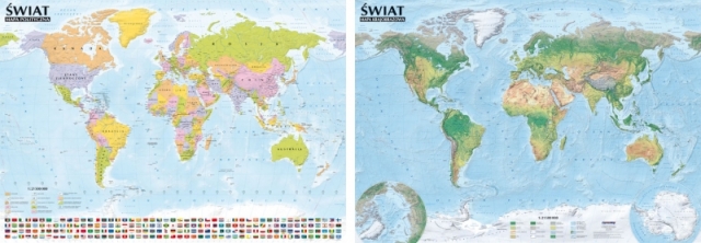 Solidna, dwustronnie laminowana mapa ścienna. Po jednej stronie znajduje się mapa polityczna świata, na odwrocie – mapa krajobrazowa.