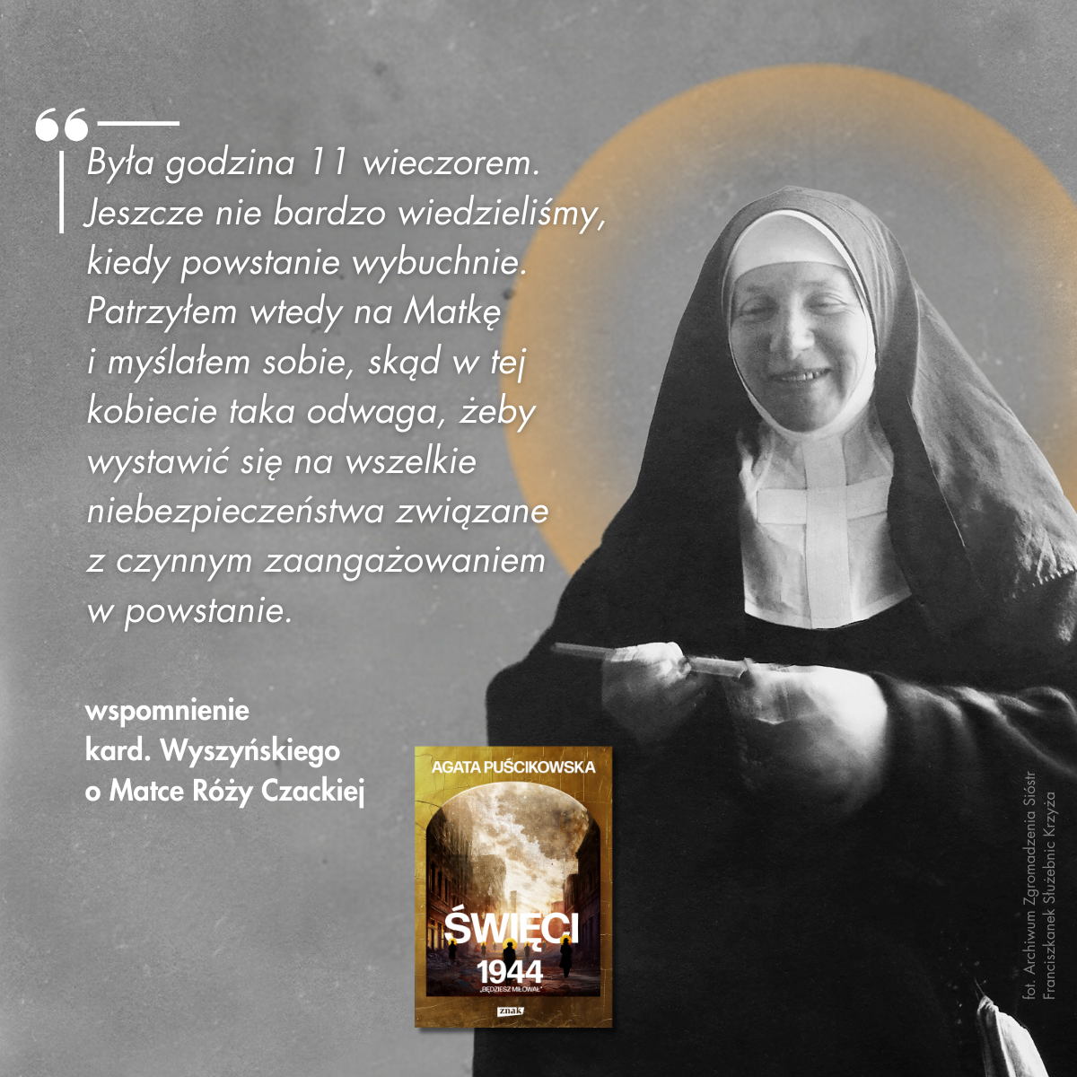 W czasach największej próby, gdy Warszawa płonęła, a ulice stały się areną heroicznej walki, siostry zakonne i księża stawili się na pierwszej linii. Ich wiara, odwaga i poświęcenie pomagały innym wytrwać w walce o wolność i godność, ale i codzienność powstańczą. Książka zawiera portrety m. in.: Róży Czackiej, Stefana Wyszyńskiego - późniejszego kardynała, Prymasa Tysiąclecia, Michała Czartoryskiego, Józefa Stankai innych, którzy w czasach największej próby łączyli w sobie chęć pomocy, świętość i bohaterstwo. Żadna z tych osób nie pochodziła z Warszawy. Ich doświadczenie i sposób patrzenia na walkę były bardzo różne. Jednak łączyła ich służba i miłość do drugiego człowieka. To historie symbole. Konkretne w wyrazie, dobrze udokumentowane, a jednocześnie... mistyczne.