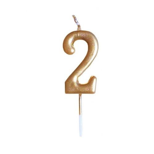 Świeczka metalizowana złota "2", na pikerze. Wysokość świeczki 6 cm, wysokość z pikerem 8 cm.