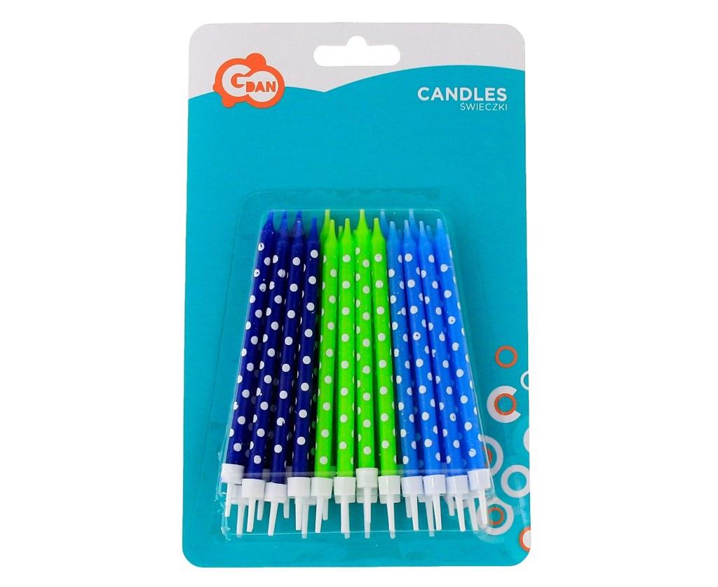 ŚWIECZKI URODZINOWE "GROCHY" DLA CHLOPCÓW. Opakowanie zawiera 24 świeczki z nadrukiem w grochy. Kolory- granatowy, ziełony,niebieski . Długość 10cm, szerokość 0,5cm. Każda świeczka zawiera podstawkę.