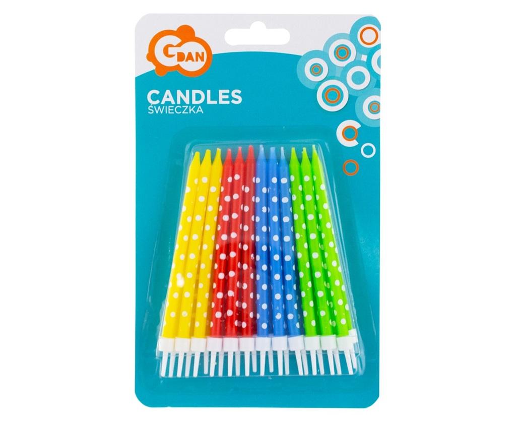 Świeczki urodzinowa na tort Świeczki urodzinowe, super dekoracja na tort dziecka Świeczki w 4 kolorach ozdobione białymi grochami W opakowaniu znajdują się 24 sztuki.