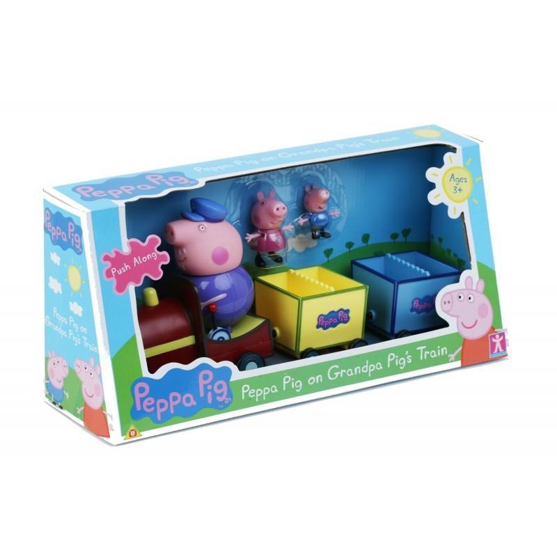 Lokomotywa z odczepianymi 2 wagonami. Zestaw wyposażony w kręcące się koła. Oprócz tego w zestawie figurka Peppy i Georgea, które można posadzić w wagonach.
