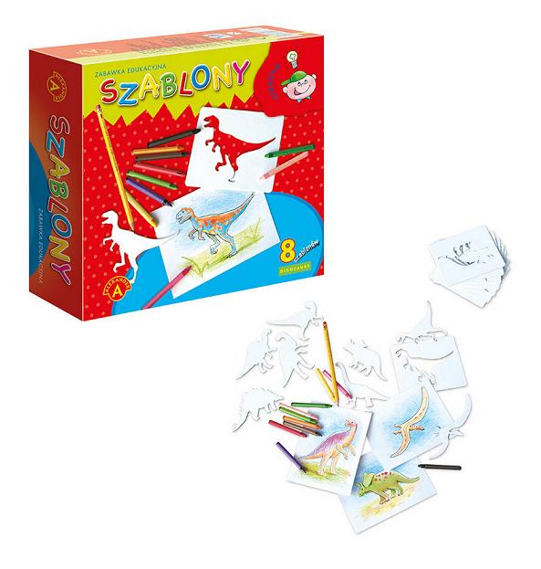 " SZABLONY" to zabawka , która składa się z 8 szablonów( w pozytywie i negatywie). Szablony przedstawiają 8 róznych sylwetek dinozaurów. Dzięki nim dziecko może w łatwy sposób narysować wybraną sylwetkę wzbogacając ją kolorem i dodatkowymi elementami.