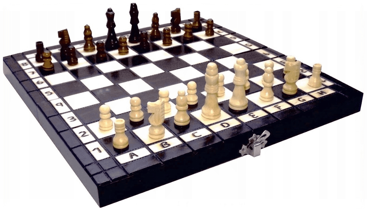 Szachy drewniane w rozmiarze 31x31cm po rozłożeniu. Sugerowany wiek graczy: 7-99 lat.