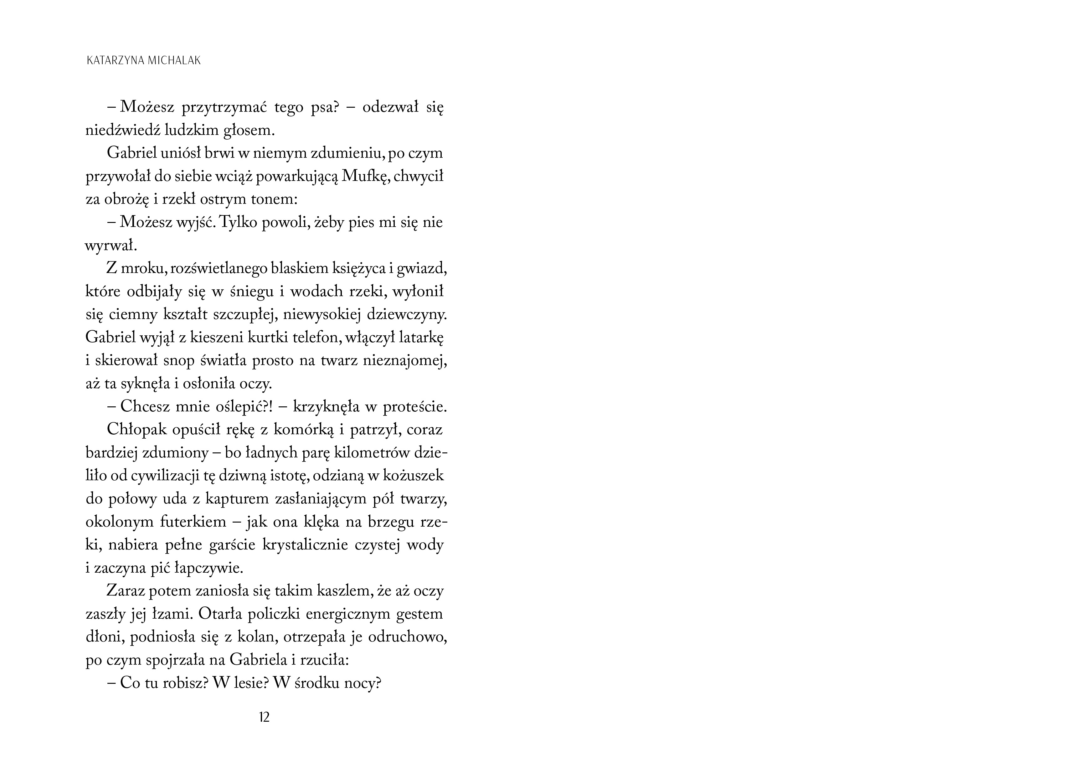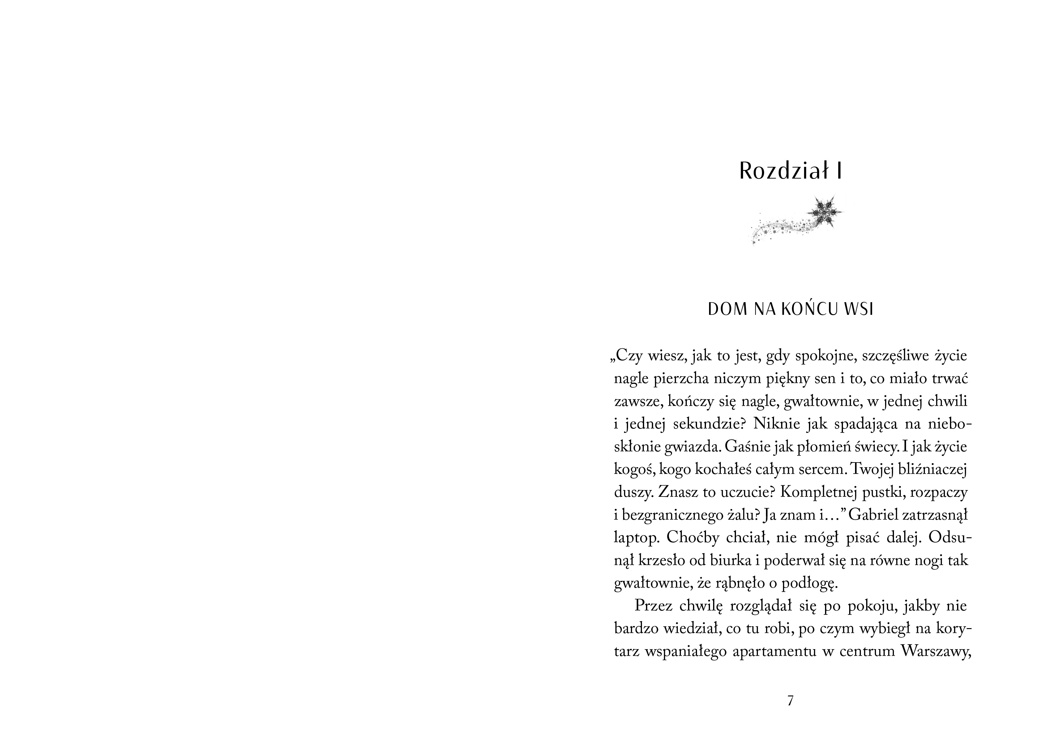 LIWIA I GABRIEL JESZCZE WCZORAJ NIE MIELI POJĘCIA O SWOIM ISTNIENIU, DZIŚ STAJĄ SIĘ DLA SIEBIE CAŁYM ŚWIATEM. On uciekł do chaty na końcu wsi trzy lata temu. Ona uciekła wczoraj. Przed ludźmi, przed złym losem, przed sobą. Spotykają się nad rzeką, w środku lasu, w noc rozjaśnioną światłem księżyca oraz gwiazd i... natychmiast zostają wrogami. Gabriel nie życzy sobie niczyjej obecności w swojej samotni. Liwia ma spędzić święta w pięciogwiazdkowym hotelu, a nie w chacie przerobionej na księgarnio-kawiarnię, do której nikt nie zagląda. JEST JEDNAK COŚ, CO TYCH DWOJE ZBLIŻY DO SIEBIE BARDZIEJ, NIŻBY CHCIELI. Śnieżna zamieć, która odcina ich od świata, a może… magia świąt? Czy dwa złamane serca i dwie poranione dusze zaufają ten jeden, ostatni raz? Przepiękna wigilijna opowieść, pachnąca choinką i domowym ciastem, ukoi, wzruszy i da nadzieję… OPINIE CZYTELNICZEK Najlepsza powieść na jesienne i zimowe wieczory! Porywająca. Kipiąca emocjami. Przywraca wiarę w ludzi, dobro i prawdziwą, szczerą miłość. Katarzyna Michalak znowu pokazała swoje mistrzostwo! „Biblioteczka Julii” Ślepy los sprawia, że Liwia i Gabriel odnajdują się w morzu samotności. Z zachwytem obserwowałam, jak zbliżają się do siebie i otwierają swoje serca. Ta powieść jest jak ognisko w środku mroźnej nocy – można podejść i ogrzać się ciepłem rodzącej się miłości. „Książkowe_impresje” Co za wspaniała historia! Poplątane losy bohaterów. Mnóstwo głęboko skrywanych tajemnic i ledwo zabliźnionych ran. Ta powieść pokazuje, że najlepszym lekarstwem na samotność jest drugi człowiek. A najlepszą terapią – miłość. Pochłonęłam książkę w jeden wieczór! Czytajcie! „Czytelniczy Zakątek”