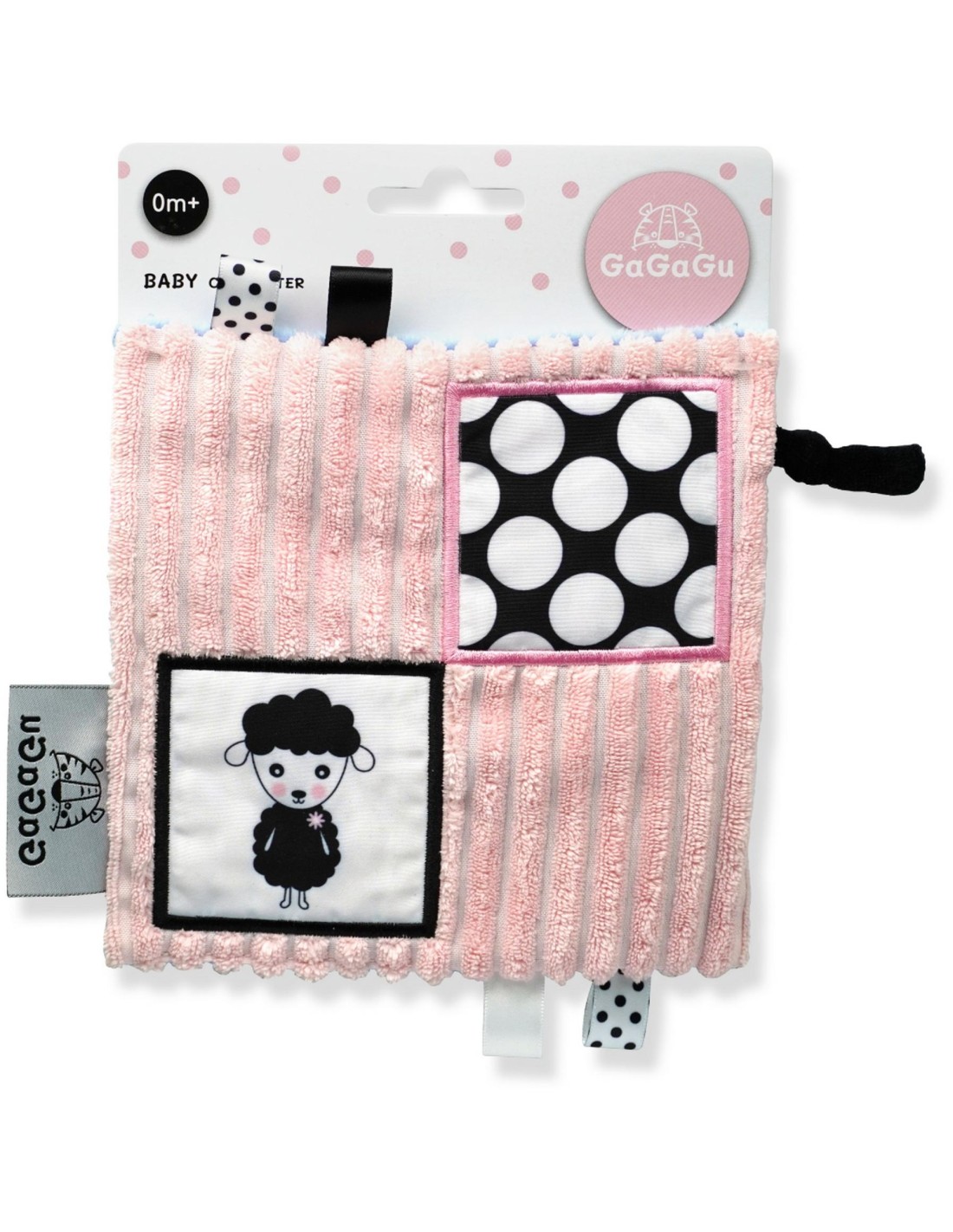 Obie strony są różne - faktury, szeleszczące materiały, geometryczne wzory, dwa kolory, dwa motywy zwierząt - tygrys, owca.
