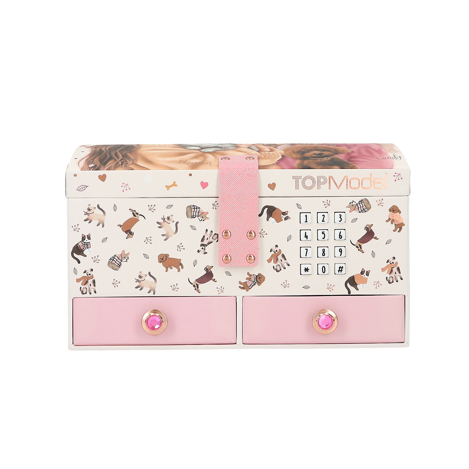 Szkatułka grająca na kod TOPModel. Super szkatułka z zamkiem szyfrowym. Po otwarciu gra przez ok. 20 sekund piosenkę Anti-Hero. Lusterko, dwie szufladki i wyciągana przegródka. Baterie w zestawie 3xLR44/AG13. Instrukcja w środku. Wiek: 6+.