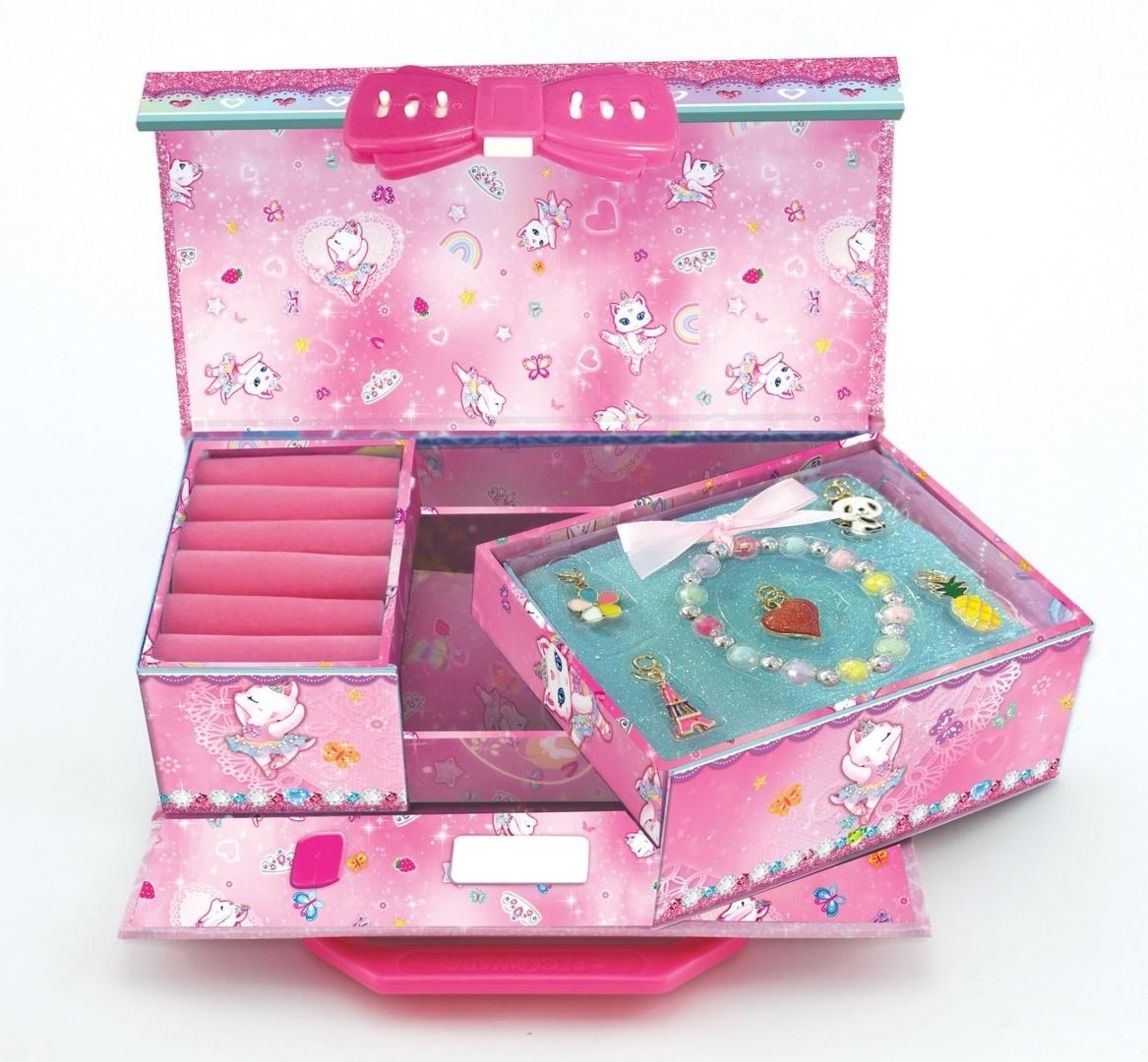 Szkatułka zamykana na zamek z szyfrem. W zestawie znajduje się bransoletkai 5 zawieszek typu ‘charms’ do dowolnego ozdabiania. Wiek: +6