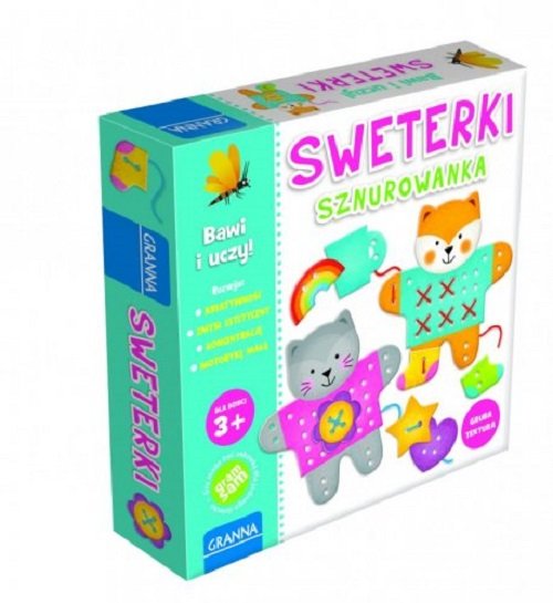 Czas stworzyć śliczny wzór na sweterku. Sznureczki w dłoń. Pora uwolnić Waszą kreatywność. Czy to będzie gwiazda, a może kwiatek? Możliwości są niemal nieograniczone! Zabawa ćwiczy motorykę małą i kreatywność.