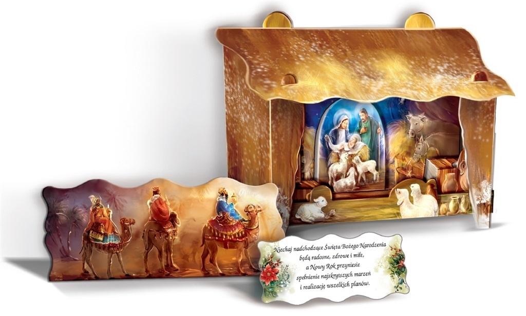 Przestrzenna szopka bożonarodzeniowa o wymiarach 6 x 22 x 15 cm. Doskonale wkomponuje się w dekoracje świąteczne każdego domu. Przedstawia Świętą Rodzinę w czasie narodzin Pana Jezusa oraz przybycie Trzech Króli. Gotowa do złożenia bez użycia kleju.